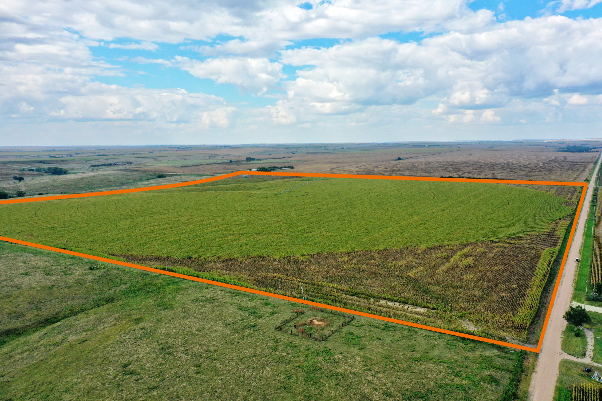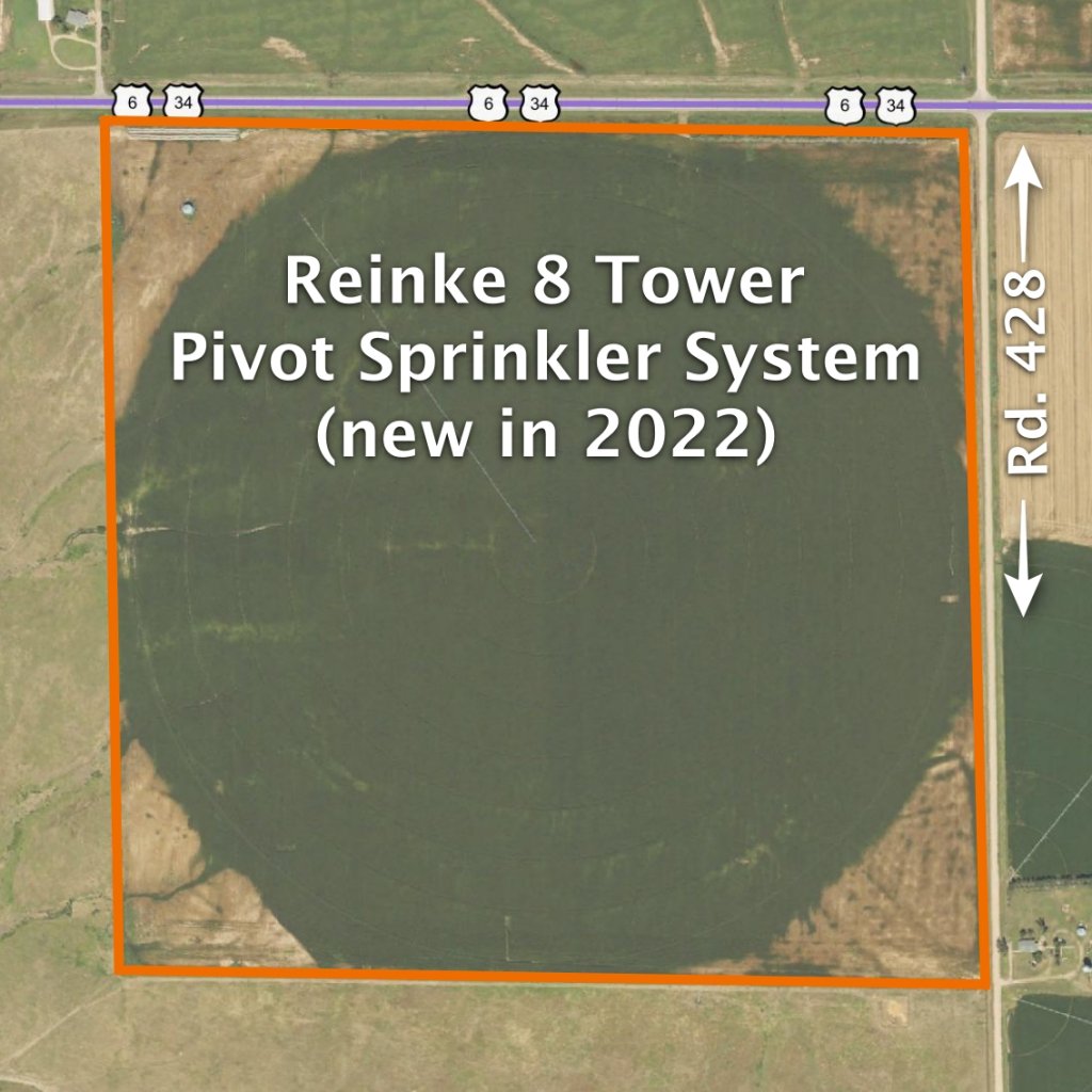 156 Acres, more or less, according to Furnas County Assessor’s records. Good quality pivot irrigated cropland with excellent access along Highway 6 & 34. Includes a Reinke 8 tower pivot sprinkler system – new in 2022. Currently irrigated by the Frenchman Cambridge Canal with 123.4 acres of surface water rights; the 2025 allocation was 9 inches. Irrigation equipment included with consists of a diesel power unit, diesel fuel tank, gearhead, and all underground pipe to the farm. The property also features an irrigation well and a livestock well. Over 70% of the soils are Holdrege Silt Loam.
