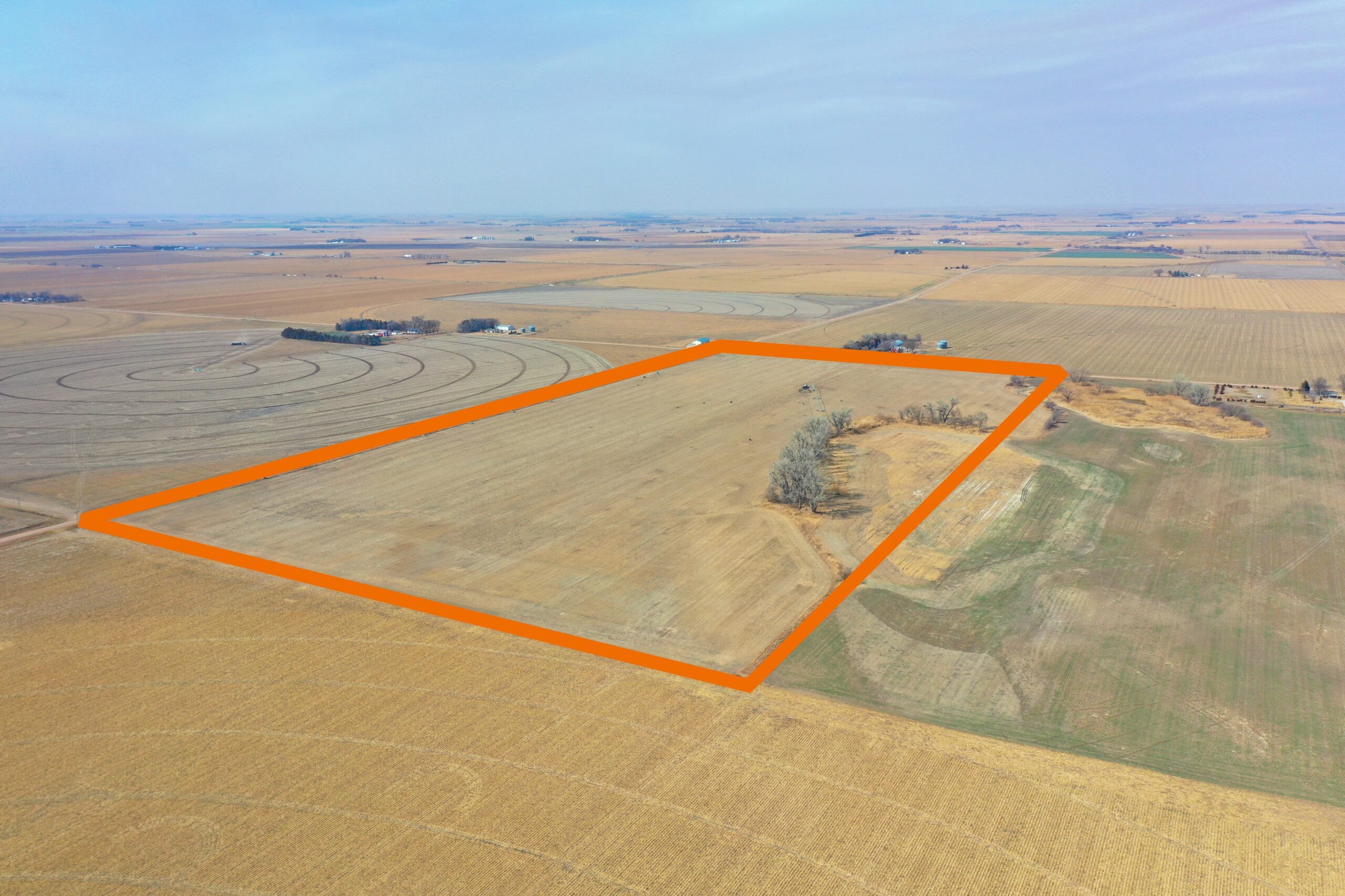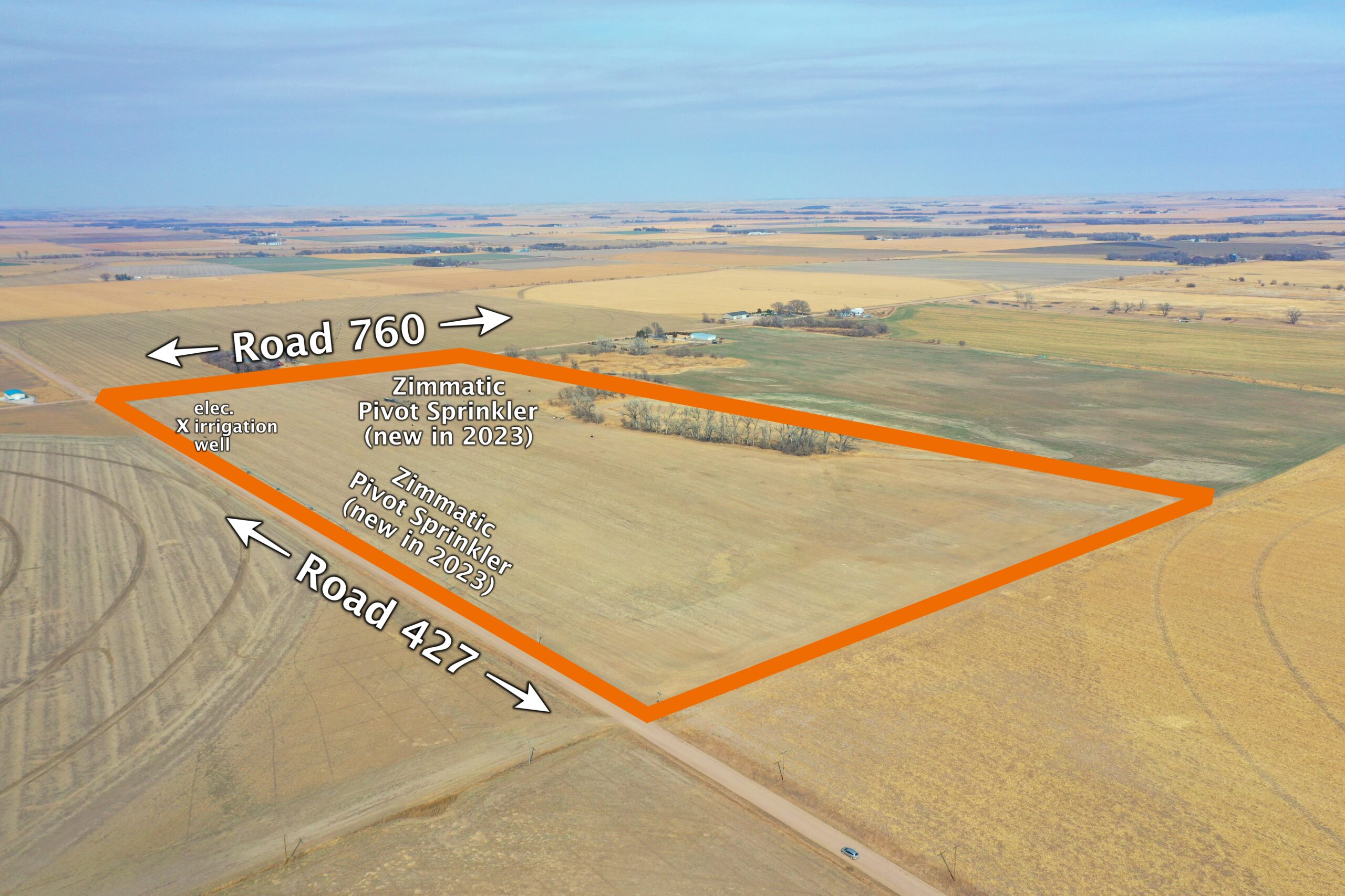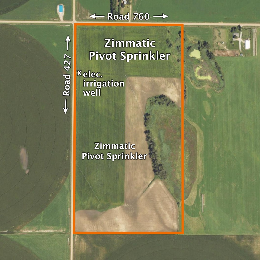 About the Land: 80.1 Acres, more or less, according to Dawson County Assessor’s records. Consisting of good quality pivot irrigated cropland and (2) three tower Zimmatic pivot sprinkler systems (both new in 2023), Remainder of the land includes non-irrigated cropland and treed area.