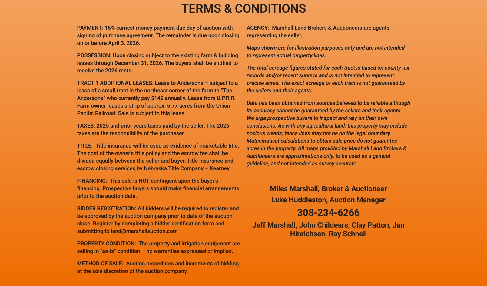 Online bidders must register and be approved by the auction company prior to the auction closing date (we recommend 48hrs. prior to the auction close). Register by completing the bidder certification form (provided by the auction company) and submitting it to Luke Huddleston, Auction Manager at luke@marshallauction.com or at physical office: 2033 Central Ave., Kearney, NE. Office 308-234-6266, Cell 308-293-7258