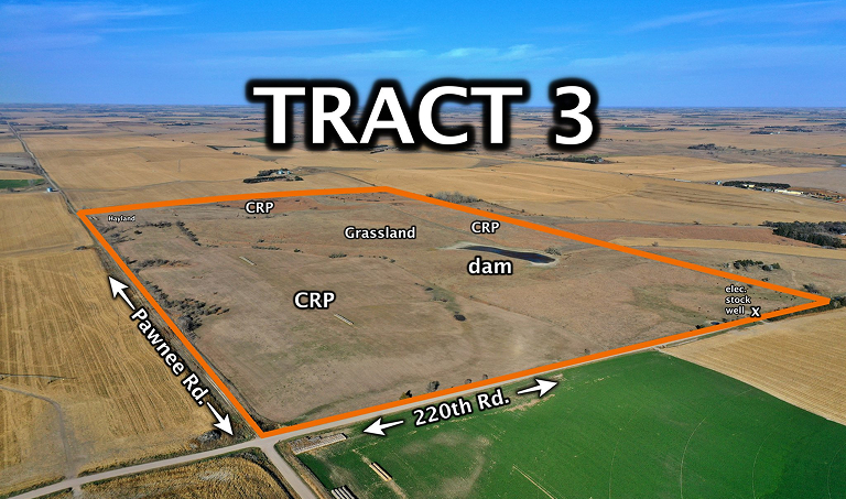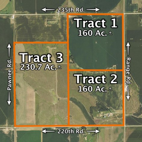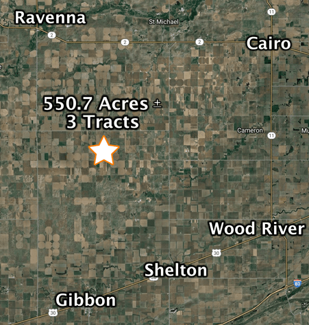 From the east edge of Gibbon, 9 miles north on Pawnee Rd. to the southwest corner of the property (Tract 3). From Ravenna, 5 miles east on Highway 2 and 7 miles south on Range Rd. to the northeast corner of the property (Tract 1).