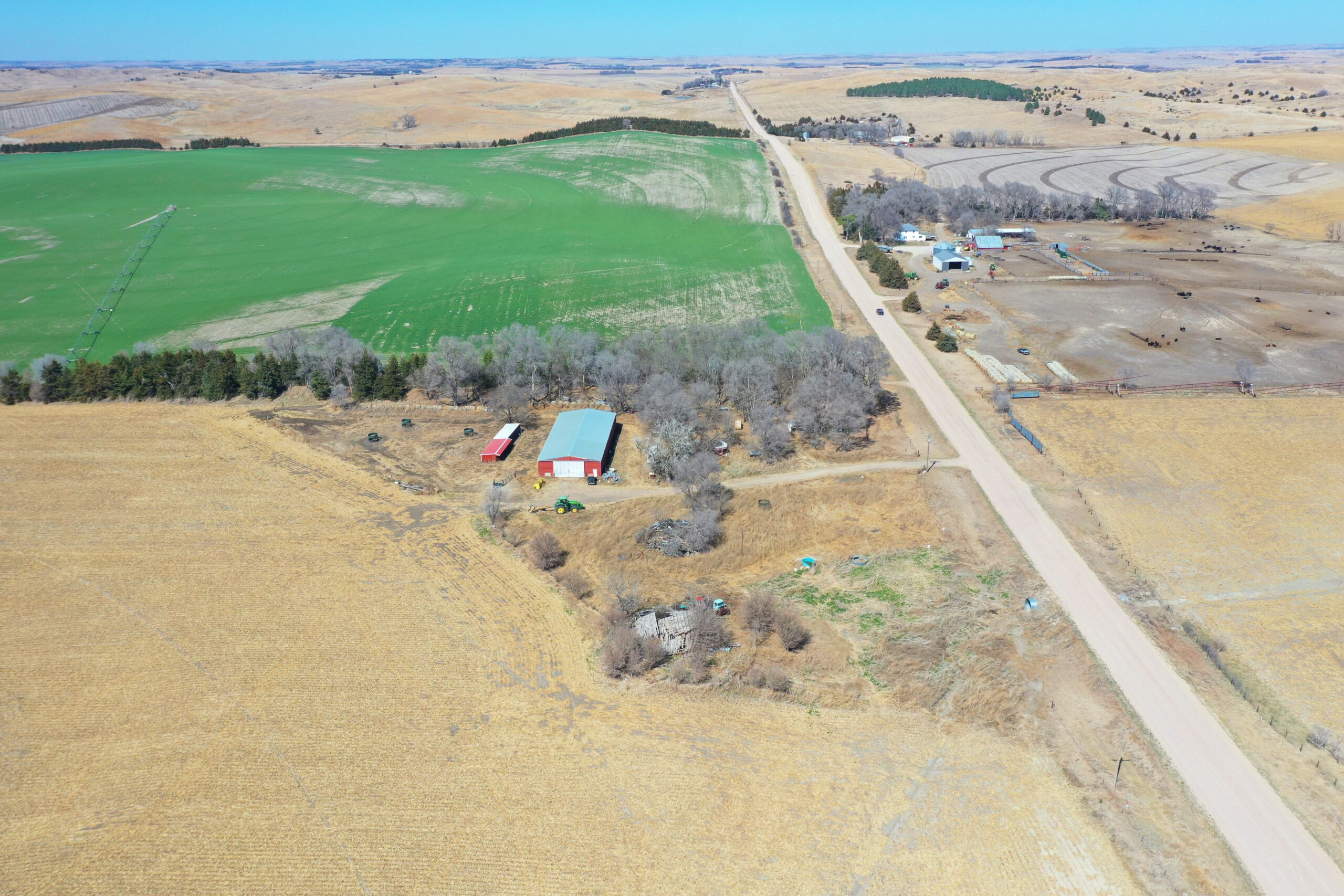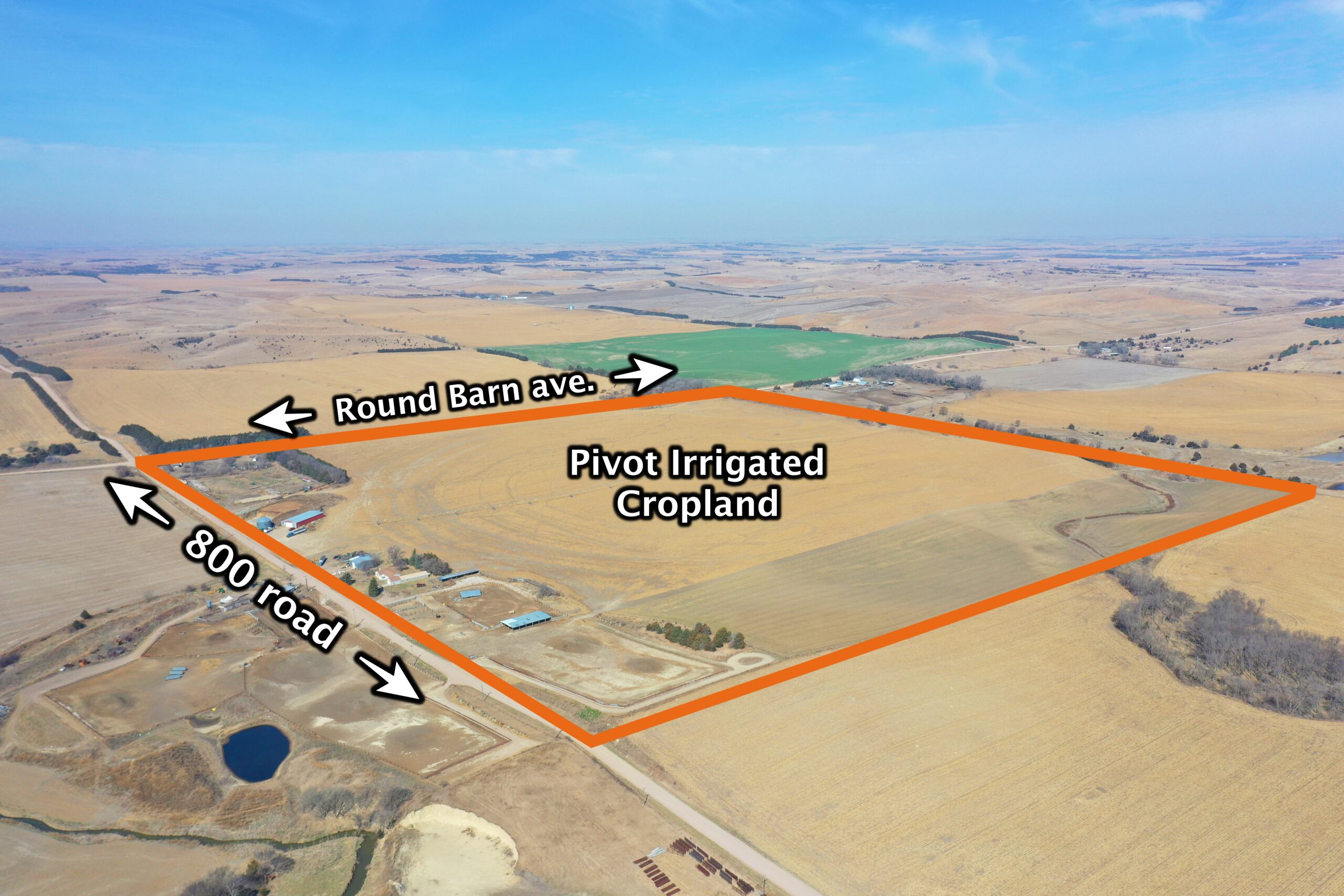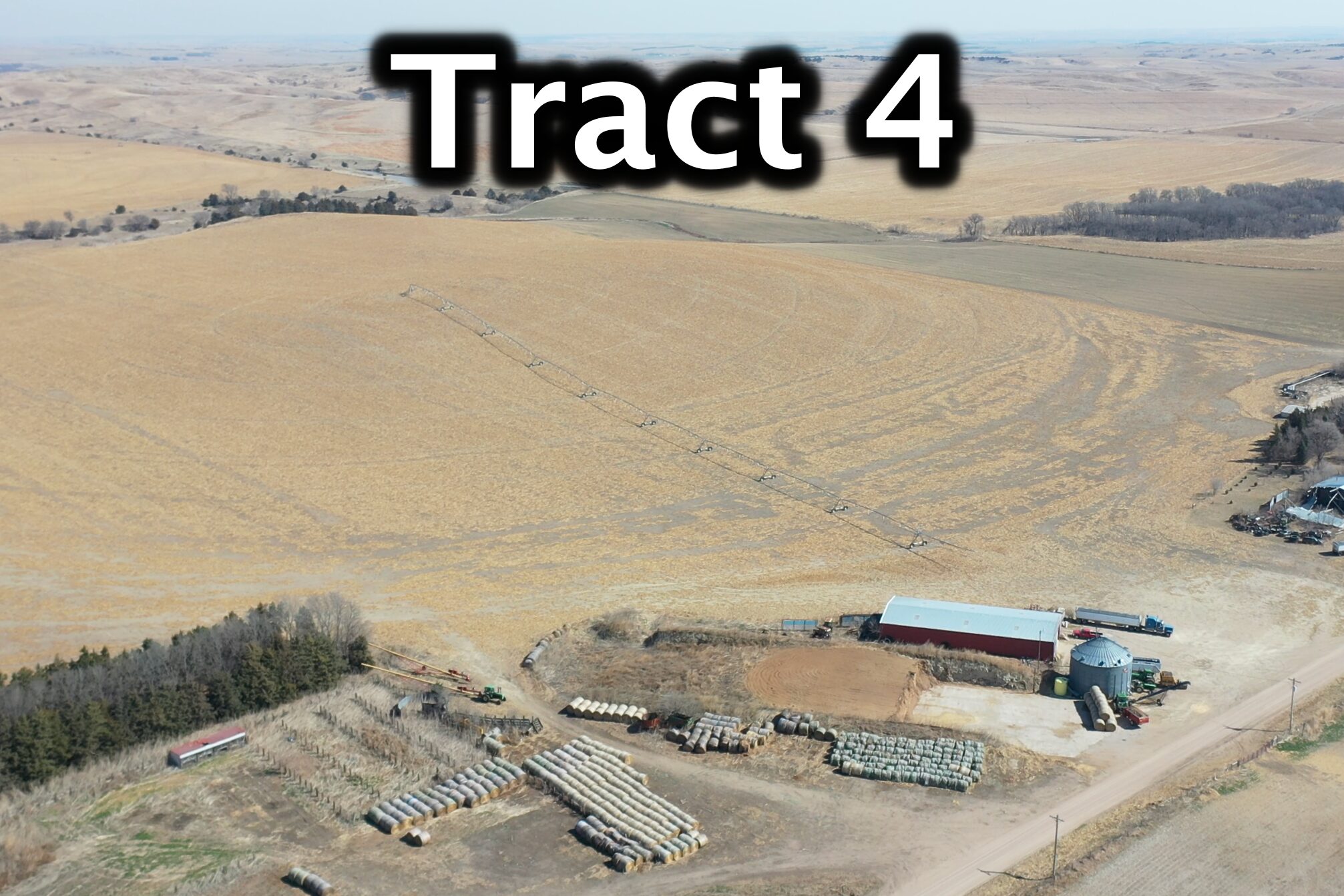 About the Land: 160 Acres, more or less, according to Valley County Assessor’s records. Pivot irrigated cropland with a 4 bedroom/2 bath ranch style home, indoor pool and attached garage and electric submersible well. Also includes an approx. 5,700 sq. ft. steel building, Chief 20,000 bu. Grain bin and older house in the southwest corner. Note: Does not have an irrigation well – in the past water was provided by the well on Tract 3. Not included – livestock fences, panels, gates, pivot system, discharge auger, sweep auger, fans & drying floor in the bin. Additions to what is Not Included: Feed (bales and silage), 5 wire barb-wire fence, continuous panels, wind break panels, calving sheds, equipment (tractors, loaders, etc.), shop items, bin fans, bin door, aeration floor and power sweep and unload auger, liquid pump and tank, pump in domestic well, guard rail, cattle panels, water tanks and stock tanks, load out chute, free standing panels, pivot bridges, feed bunks, diesel irrigation motors and fuel tanks, gates, fuel tanks, 9 tower Zimmatic pivot and control boxes.